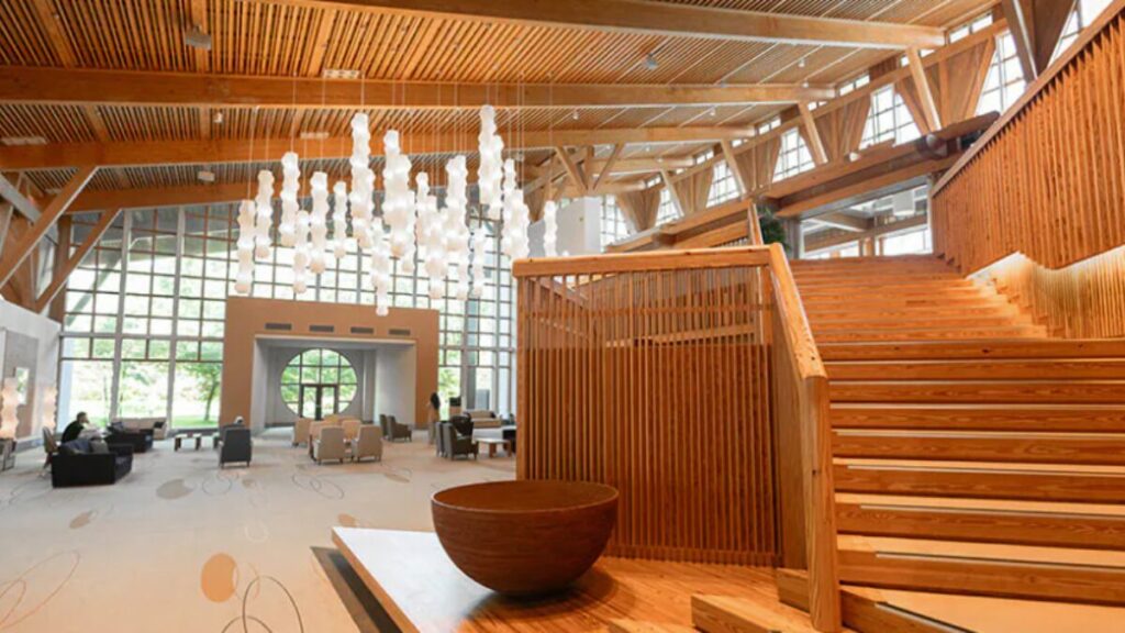 全体が和の職人技と西洋のモダンデザインを融合した造りで、3階までの吹き抜けの広々としたロビーには自然光が差し込み開放感があります。