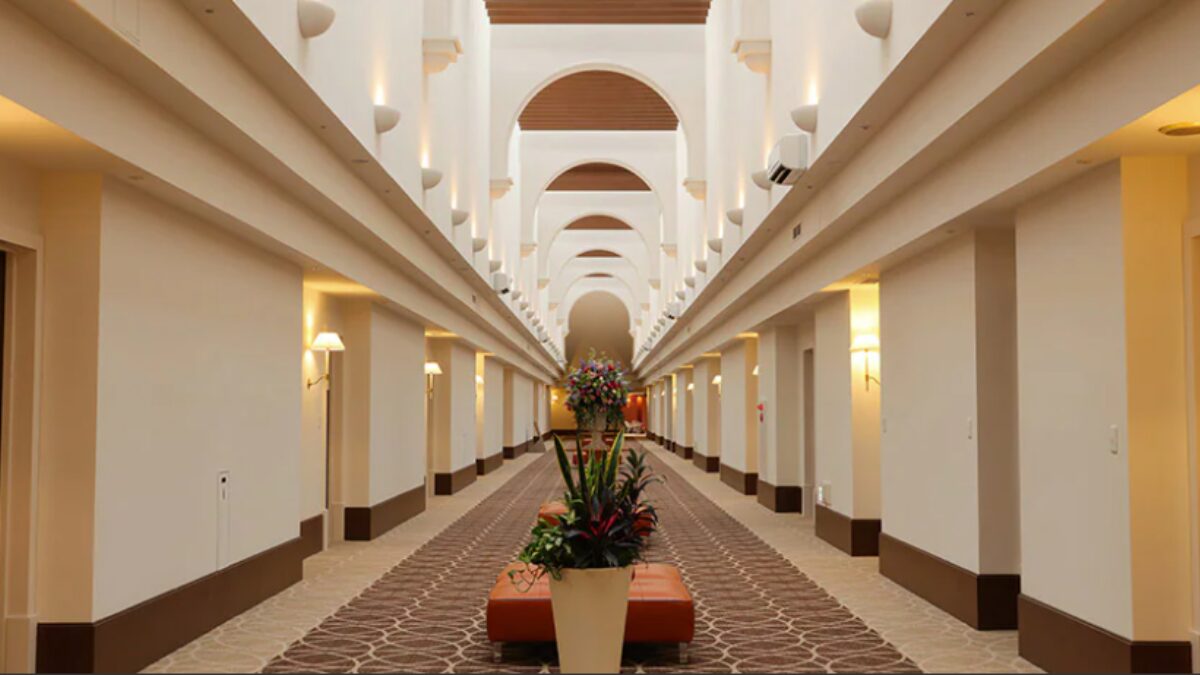 全体が和の職人技と西洋のモダンデザインを融合した造りで、3階までの吹き抜けの広々としたロビーには自然光が差し込み開放感があります。