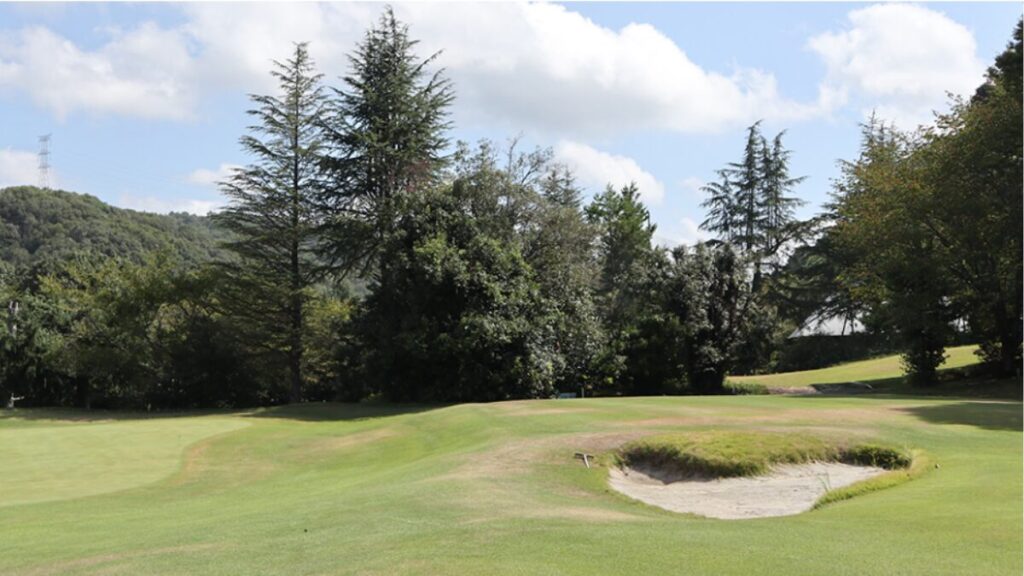 瀬戸内海から吹き付ける海風に加え、高く盛られた「砲台グリーン」と深いガードバンカーが待ち構えており、正確なアイアンショットと距離感が試されます。